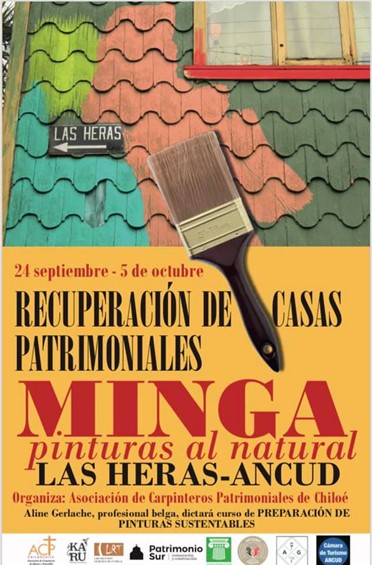 En el 2019, con el equipo de Karü pinturas ecológicas, participamos a una minga para la restauración de casa patrimoniales. Karü es un proyecto de crear una pintura realmente ecológica en Chile que cubra las necesidades de todos los tipos de clima que ustedes tienen en su hermoso país. Yo he trabajado en el norte en zonas desérticas, pintando casas del área, he pintado edificios y casas en Santiago y he estado regularmente en Chiloé restaurando figuras en las iglesias de distintas islas y así conocí a la comunidad y me invitaron a esta minga para restaurar casas patrimoniales con pintura ecológica que yo preparo y uso en Bélgica. Así que la pintura debía resistir el clima de Chiloé. Llegamos un par de días antes para probar la pintura y así quedaríamos tranquilos para comenzar la minga.